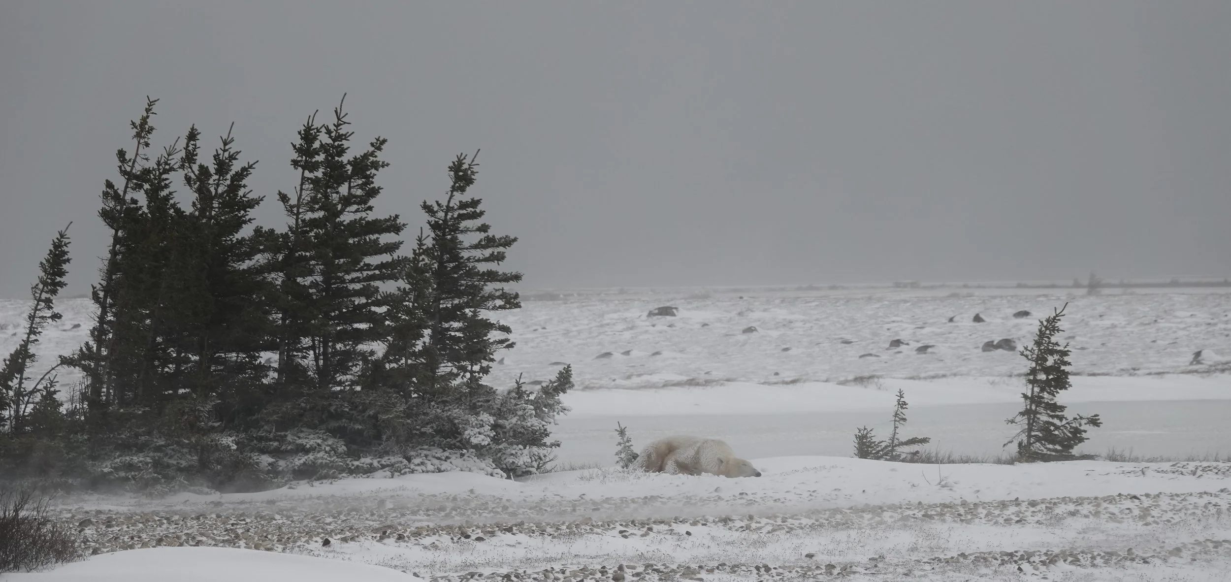 While trundling out to the prime polar bear viewing area in the tundra buggies, we spotted a bear hunkered down and sleeping, sheltering itself from the wind. Notice the nearby spruce trees – winds from the north are strong so they have few branches on the windward side.